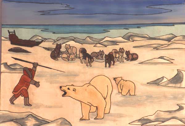 Dinner for 100 Arctic Painting polar bear painting w, Inuit hunter watercolour on paper painting 8" x 10" |